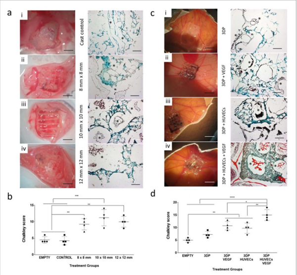 CAM模型中對(duì)3D打印支架血管化的功能研究。與投射對(duì)照相比,將無(wú)細(xì)胞3D打印的3-3-3支架植入CAM。