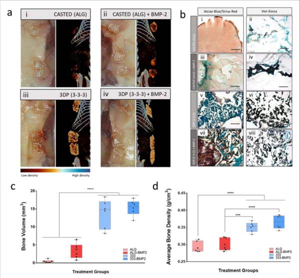 在研究過(guò)程中,科學(xué)家利用蒙皂石納米粘土懸浮液Laponite(LAP)的理化特性,并將其與HBMSC,骨形態(tài)發(fā)生蛋白2(BMP-2)和血管內(nèi)皮生長(zhǎng)因子結(jié)合使用,以生產(chǎn)LAP-藻酸鹽-甲基纖維素生物墨水。從正常的足月分娩后的健康母親的臍帶中獲得的,從接受常規(guī)髖關(guān)節(jié)手術(shù)的患者中收集的HBMSC和從健康母親的臍帶中獲得的HUVEC,被封裝在生物墨水中,并使用內(nèi)部?jī)?nèi)置的生物打印機(jī)打印。印刷后,將支架在無(wú)菌氯化鈣溶液中孵育10分鐘以實(shí)現(xiàn)交聯(lián)。載有HBMSCs的3D生物打印支架的骨架功能在體外,離體和體內(nèi)進(jìn)行了研究。結(jié)果表明,在3DP中添加HBMSC可以顯著改善礦化組織的形成,但在鑄模散裝腳手架中則不會(huì)。