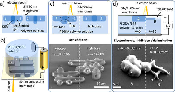 為了有效地將聚焦的電子束和軟X射線束傳遞到其液體溶液中,研究人員設(shè)計(jì)了一組封閉的流體室。這些設(shè)備配備有30–50 nm的氮化硅(SiN)薄膜,可將液體與顯微鏡的真空隔離。在測試過程中,將20%w / v的聚(乙二醇)二丙烯酸酯(PEGDA)水溶液和9個(gè)相同的膜窗填充到腔室中。通過僅改變光束的一個(gè)參數(shù)(例如光束的能量,強(qiáng)度,步長或停留時(shí)間),同時(shí)保持其他參數(shù)不變,屏障被用于創(chuàng)建具有一系列不同特征集的零件。