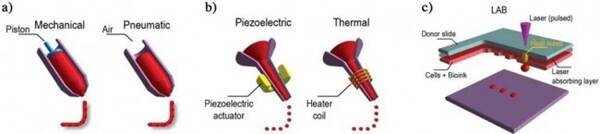 生物3D打印是指可用于制造包含細(xì)胞和材料的3D物理結(jié)構(gòu)的技術(shù)。如圖3所示,常用技術(shù)包括擠出打印、噴墨打印、激光輔助打印和立體平面打印。噴墨打印基于一滴一滴的生物墨水沉積,并使用不同的操作機(jī)制,如熱、壓電、靜電、聲學(xué)、流體動(dòng)力學(xué)和微型閥來產(chǎn)生生物墨水液滴。擠出打印依賴于使用氣動(dòng)或機(jī)械壓力推動(dòng)生物墨水通過噴嘴。生物墨水沉積,通過在平臺(tái)上沿X-Y方向光柵掃描打印頭而發(fā)生,打印頭或載物臺(tái)沿 Z 方向移動(dòng),允許逐層放置。在激光輔助打印中,玻璃或石英帶被一薄層金屬覆蓋,然后裝載生物墨水。激光脈沖誘導(dǎo)金屬膜蒸發(fā),形成高壓氣泡,將生物墨水液滴推向基底。在立體平面打印中,激光以逐點(diǎn)方式固化光敏樹脂,形成 3D 結(jié)構(gòu)?;谕队笆焦夤袒?D打印(DLP)使用數(shù)字微鏡陣列器件,該器件由數(shù)百萬個(gè)可單獨(dú)尋址的微鏡組成,這些微鏡可以打開或關(guān)閉,以逐層的方式固化目標(biāo)投影3D結(jié)構(gòu)的整個(gè)平面。DLP為使用微米分辨率打印3D結(jié)構(gòu)提供了卓越的速度、分辨率、可擴(kuò)展性和靈活性。