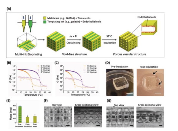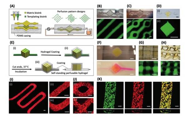 近期,為了克服以上構(gòu)建三維構(gòu)建血管網(wǎng)絡(luò)方法的缺點(diǎn),以明膠和GelMA作為3D打印的生物墨水,倫敦帝國(guó)理工學(xué)院生物醫(yī)學(xué)工程研究所Molly M.Stevens團(tuán)隊(duì)在Advanced functional materials上發(fā)表題為“Void-Free 3D Bioprinting for In Situ Endothelialization and Micro?uidic Perfusion”的文章,如圖1A圖所示,研究者以溫敏的明膠基生物墨水作為可打印的犧牲模板,以可光交聯(lián)的GelMA作為填充細(xì)胞外基質(zhì)模板。37℃下,明膠自發(fā)溶解形成貫穿的血管網(wǎng)絡(luò)框架。