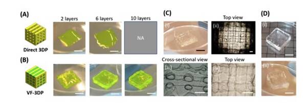 以濃度分別為7.5 wt%的明膠和5 wt% GelMA作為生物墨水,研究者對(duì)比了直接3D打印法和無(wú)孔隙3D打印法構(gòu)建帶有孔隙結(jié)構(gòu)的GelMA凝膠網(wǎng)絡(luò)。實(shí)現(xiàn)發(fā)現(xiàn)無(wú)孔隙3D打印法的可打印性更強(qiáng),凝膠的網(wǎng)絡(luò)結(jié)構(gòu)更加穩(wěn)定。且該打印方法也適用于其他生物墨水的3D打印,如雙鍵改性的透明質(zhì)酸等(圖2)。