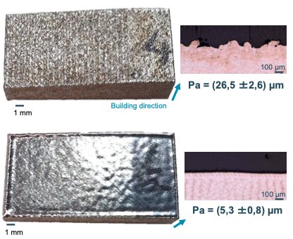 重熔過程之前(上方)和之后(下方)的印刷零件和橫截面。表面更加光滑,消除了階梯效應(yīng)。