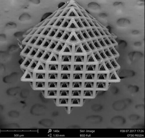 SEM觀察到的使用投影顯微立體光刻打印技術(shù)得到的經(jīng)典的八位元晶格和拓?fù)鋬?yōu)化,