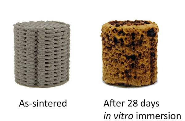 該小組的方法涉及將聚合物溶劑與鐵微粒混合,制成復合油墨。一旦支架結構被印刷,就將它們加熱以燃燒掉聚合物,從而留下鐵。然后將剩余的鐵結構進一步熱處理以將其燒結成多孔固體。Zadpoor和他的同事將他們印刷的多孔支架浸入經(jīng)過特殊配制的模擬體液中,并確定了此植入物有很高的生物降解率,鐵每28天損失7%的質(zhì)量。研究小組還發(fā)現(xiàn)腐蝕發(fā)生在植入物周圍甚至內(nèi)部,但是它們的機械性能仍然與人體骨骼保持一致。
