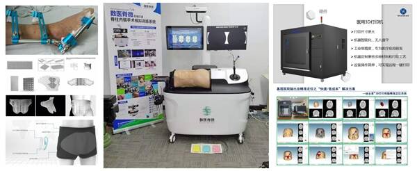 (圖注:左側由上到下依次為“數(shù)字化醫(yī)療”競賽單元三等獎——江西省人民醫(yī)院主治醫(yī)師董謝平的全能型單臂式外固定架、南京力勤文化發(fā)展有限公司的腰部康復支具設計、鄭州輕工業(yè)大學聯(lián)合鄭州大學附屬醫(yī)院、河南省中醫(yī)藥大學合作研發(fā)的數(shù)字化髖部護具;右側由上到下依次為二等獎——江蘇閃造三維科技有限公司的基于5G技術的醫(yī)工結合支具輔具智能智造平臺建設、北京匯智康科技有限公司的“為中國基層醫(yī)院腦出血手術精致化”解決方案之——3D打印顱腦精準定位技術+內鏡技術;中間為一等獎——北京數(shù)醫(yī)科技有限公司的高仿真虛實融合臨床技能智能訓練平臺)