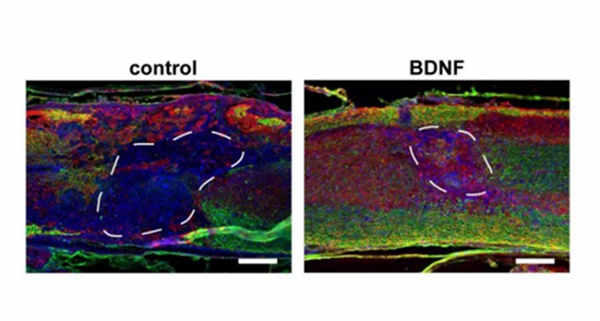 在小鼠測試中,該團隊將這種支架生物材料注入脊髓損傷部位。他們發(fā)現(xiàn),與接受不含載體的支架的對照組相比,接受了含有BDNF載體的支架的小鼠,更多的細胞浸潤了支架,基因傳遞和組織修復也得到了改善。