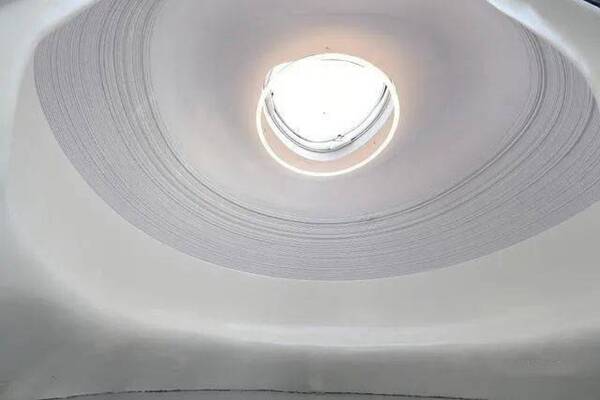 據(jù)了解,書屋內(nèi)部面積大概不到30平方米,可以容納15個(gè)人在里面活動(dòng)。書屋用的混凝土沒有鋼筋,加入了纖維作為抗拉材料,性能和普通混凝土差不多甚至更好,也防震。書屋“外殼”有兩種不同的紋理。一種是正常的打印肌理,形成一層一層的紋路;另一種是門口體現(xiàn)凹凸變化的肌理,由設(shè)計(jì)團(tuán)隊(duì)精心設(shè)計(jì),這些造型全都在電腦內(nèi)設(shè)計(jì)好,并轉(zhuǎn)換成代碼,用機(jī)械臂打印出來。