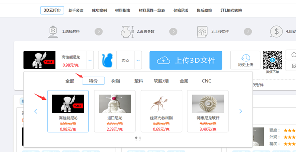 報(bào)價(jià)頁(yè)面材料欄里,點(diǎn)擊特價(jià),選擇0.98元/克尼龍,上傳3D模型,即可實(shí)時(shí)報(bào)價(jià),享受優(yōu)惠。