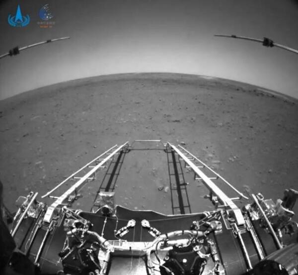 Picture:The black and white image taken by an obstacle avoidance camera installed in front of the rover of Chinas Mars probe Tianwen-1 shows that a ramp on the lander has been extended to the surface of Mars. The terrain of the rovers forward direction is clearly visible in the image, and the horizon of Mars appears curved due to the wide-angle lens. Source: XInhuaNet