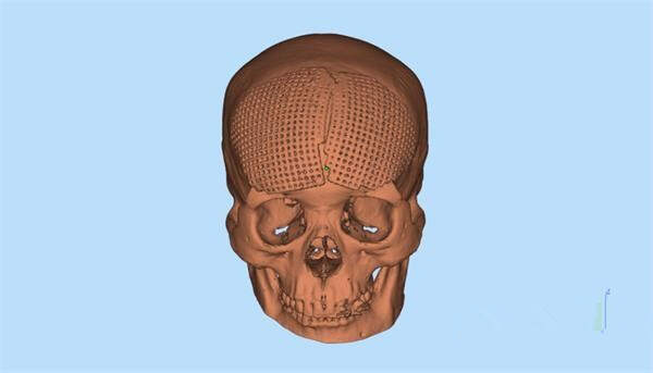 在多方面考慮研究后,最終決定給患者應(yīng)用3D打印鈦網(wǎng)技術(shù),實(shí)現(xiàn)顱骨缺損的手術(shù),最大程度上恢復(fù)患者的顱骨外形,同時(shí)改善顱骨缺損導(dǎo)致的腦積水癥狀。經(jīng)過精準(zhǔn)術(shù)前測(cè)量,泰安市中心醫(yī)院與上海交通大學(xué)醫(yī)學(xué)3D打印創(chuàng)新研究中心的工程師及專家進(jìn)行反復(fù)溝通,個(gè)性化定制出完全符合該患者自身尺寸及規(guī)格的假體,制定打印出來(lái)匹配的顱骨鈦網(wǎng)。手術(shù)過程非常順利,成功為患者進(jìn)行顱骨修復(fù),術(shù)后效果良好,患者無(wú)不良反應(yīng)。
