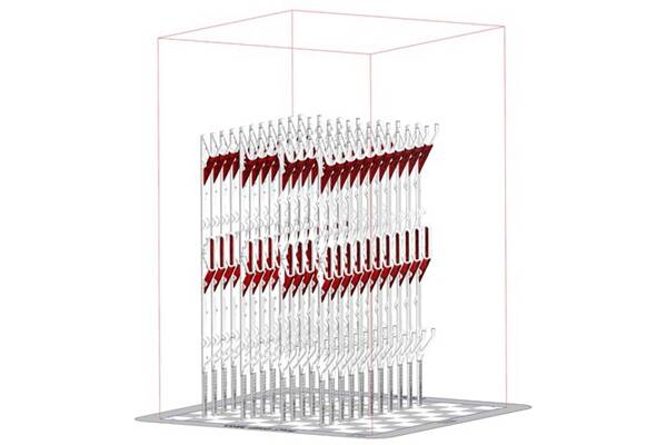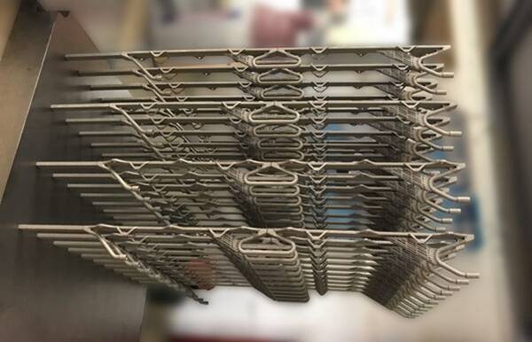 3D打印冷卻棒,最終的冷卻棒設(shè)計具有 "彈簧 "和支持結(jié)構(gòu),只限于兩個區(qū)域。在3D Systems公司的DMP 350 Flex中,可以一次3D打印多個棒。圖片來源:3D Systems