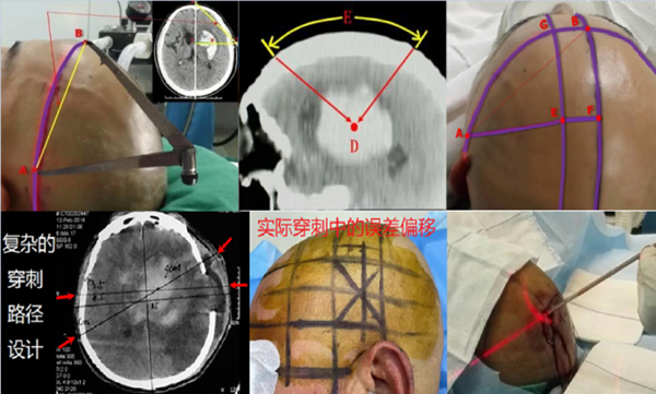 準(zhǔn)確而安全的穿刺是保證腦出血鉆孔引流手術(shù)治療效果和預(yù)防并發(fā)癥的關(guān)鍵,一方面,目前常用的定位方式,如依據(jù)CT圖像,通過復(fù)雜的體表定位和角度修整計(jì)算確定進(jìn)針路線、或依據(jù)術(shù)中體外導(dǎo)航等方式,存在誤差大、易受患者自身影響、亦或有費(fèi)用高昂、臨床操作復(fù)雜等問題;另一方面,由于大腦組織精細(xì)而又復(fù)雜的功能分區(qū),穿刺過程中穿刺針或引流管很容易因?yàn)橐恍┪⑿〉钠贫鴵p傷大腦的正常功能區(qū),造成術(shù)后的肢體功能障礙或癲癇等。