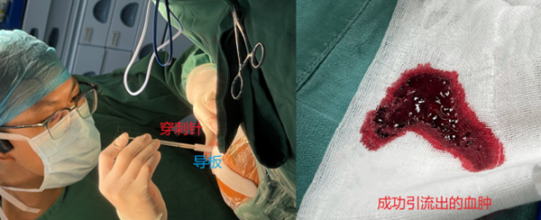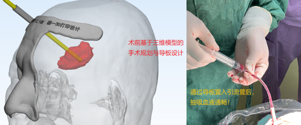 隨后謝竹青主任團(tuán)隊(duì)的肖虎醫(yī)師在3D打印導(dǎo)板導(dǎo)航下實(shí)施血腫精準(zhǔn)穿刺引流術(shù),將一個(gè)直徑5mm的軟管通過導(dǎo)板和穿刺針準(zhǔn)確放置到了血腫中心點(diǎn),成功抽出血腫,耗時(shí)僅30分鐘就完成了手術(shù)。