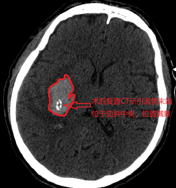 術(shù)后復(fù)查顱腦CT,證實(shí)穿刺引流管位于血腫的中心,通過腦出血的引流,患者腦組織功能出現(xiàn)了明顯改善和恢復(fù),患者的偏癱明顯減輕,目前正在進(jìn)一步康復(fù)治療中。
