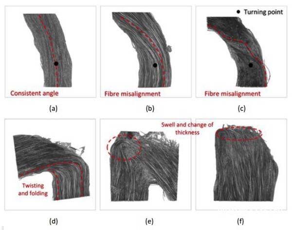 近些年,連續(xù)碳纖維增強復合材料由于其具有諸如高比強度和高比剛度等優(yōu)越的機械性能已經(jīng)被越來越多地應(yīng)用于飛機機身和其他高端工業(yè)產(chǎn)品。對于具有復雜幾何形狀的復合材料零件,可以在FDM工藝中根據(jù)性能要求鋪設(shè)纖維。但在FDM打印過程中,噴嘴牽引纖維轉(zhuǎn)向過程中可能會出現(xiàn)一些缺陷,包括平面外起皺、起泡、牽引向上拉和剪切效應(yīng)。從而進一步影響制件的機械性能。