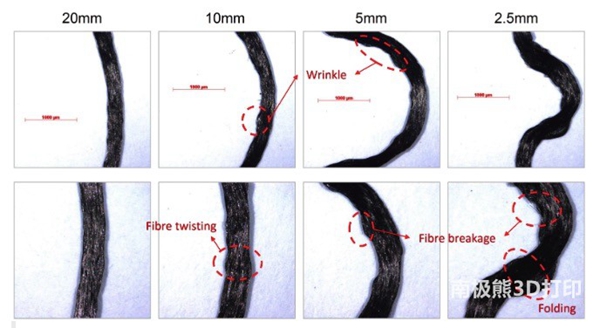 2 FDM工藝打印的不同曲率半徑的碳纖維長絲
