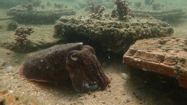 △生活在ArchiREEF位于香港海下灣海洋公園的粘土礁瓦片試驗場的墨魚。Vriko Yu