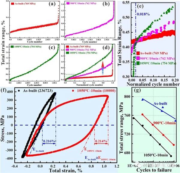 1. a-c)未退火和900 /1050 ℃退火樣品的總應(yīng)變范圍-循環(huán)次數(shù)關(guān)系;(d)總應(yīng)變范圍-歸一化循環(huán)次數(shù)(N/Nf)關(guān)系;(e)圖1d)中歸一化循環(huán)次數(shù)在0.2以內(nèi)的曲線放大圖;(f)未退火和1050 ℃退火樣品達(dá)92%疲勞壽命時(shí)的滯后回線;(g)總應(yīng)力范圍-失效循環(huán)次數(shù)關(guān)系。