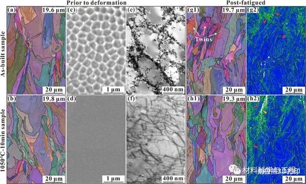 2. 未退火樣品與1050 ℃退火樣品變形前后的顯微組織。(a, b, g1, h1)帶襯度(BC)和晶粒取向分布疊加圖;(c, d)變形前胞結(jié)構(gòu)SEM照片;(e, f)變形前位錯組織TEM照片;(g2, h2Kernel平均取向差(KAM)分布圖。