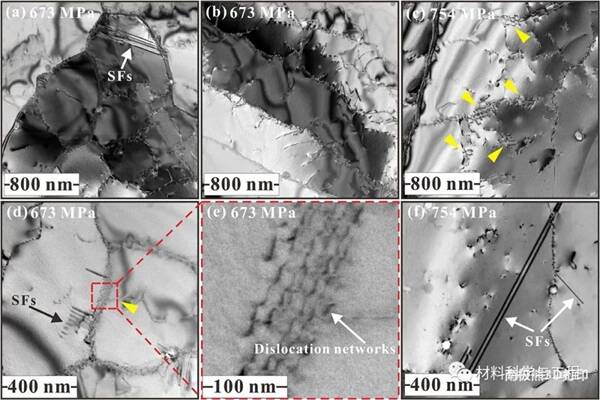 4. 1050 ℃退火樣品變形后的TEM明場照片。(a, b)位錯亞結(jié)構(gòu)如位錯胞和位錯條紋;(c-e)位錯胞放大照片,包括致密位錯網(wǎng);(f)少量SFs。