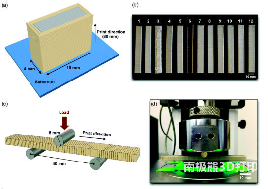 層間結(jié)合強(qiáng)度的測試如圖1所示,根據(jù)ISO 178確定出如圖1(a)所示的標(biāo)準(zhǔn)模型,并將樣本置于垂直方向進(jìn)行打印,改變工藝參數(shù)條件制備如圖1(b)所示12組測試樣件,為驗(yàn)證層間結(jié)合強(qiáng)度將樣品進(jìn)行如圖1(c)和(d)所示的三點(diǎn)彎曲試驗(yàn),試驗(yàn)載荷垂直于沉積方向施加,并施加到印刷層之間的界面。在下表面張力的作用下,失效主要由層間的粘結(jié)所決定。
