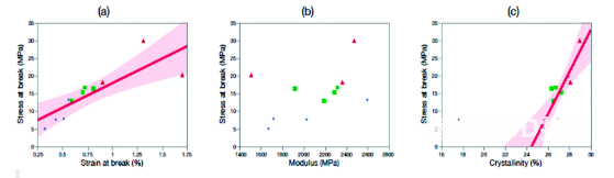 2 斷裂應(yīng)力與(a)斷裂應(yīng)變,(b)模量,(c)結(jié)晶度關(guān)系