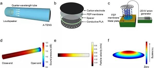 該工作提出了一種具有結構可控性、一次性成型、制作簡單、成本低等特點的3D打印A-TENG。開發(fā)并仔細研究了一個四分之一波長的聲諧振器系統(tǒng)與A- TENG相結合,用于高性能的聲能捕獲。