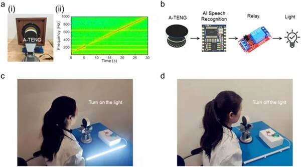 此外,還開發(fā)了一種基于A-TENG的自供電語音識別系統(tǒng),該自供電系統(tǒng)可以在不需要云計算的情況下應用于實時語音識別,是一種低功耗、低成本的智能邊緣感知技術。但該工作對于器件優(yōu)化及穩(wěn)定性探究較少,需要更多研究。