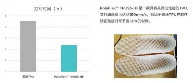 近幾年,3D打印鞋墊在業(yè)內(nèi)的發(fā)展也是愈發(fā)火熱。首先通過儀器去掃描患者的足型,再基于掃描儀收集到的數(shù)據(jù)設計矯正鞋墊,接著再3D打印,最后可直接交付患者使用。為此,Polymaker也推出適配該解決方案的材料:PolyFlex TPU95-HF。傳統(tǒng)TPU材料最大的難點是材料本身的柔性會導致3D打印過程中進料比較困難,打印速度也就相對慢一些,導致單位小時內(nèi)的產(chǎn)量極低。為此我們開發(fā)了這款有高速打印的特性的TPU,可以極大地提高生產(chǎn)效率。使用普通的TPU打印一雙矯正鞋墊,將花費至少4-5小時,如果使用Polymaker的這款TPU進行打印,可以節(jié)省大約50%的時間。