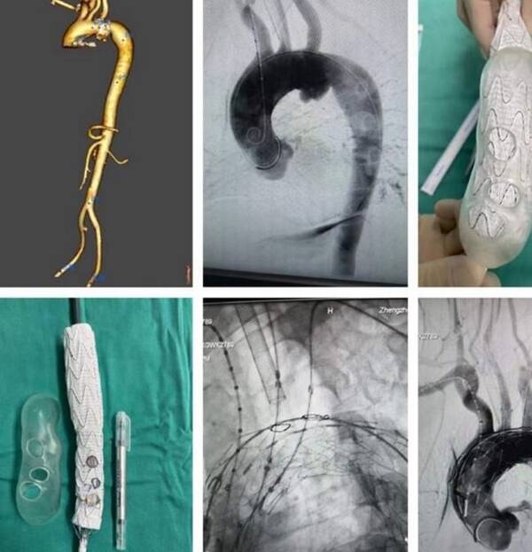 另一位53歲的男性患者,以“右側(cè)肢體無力伴語言不清,胸主動脈瘤3天”為主訴入院,于外院查頭頸CTA提示主動脈弓動脈瘤,瘤體累及左鎖骨下動脈、左頸總動脈,錨定區(qū)不足,3D打印輔助體外三開窗,完美隔絕胸主動脈瘤并重建弓上三分支。