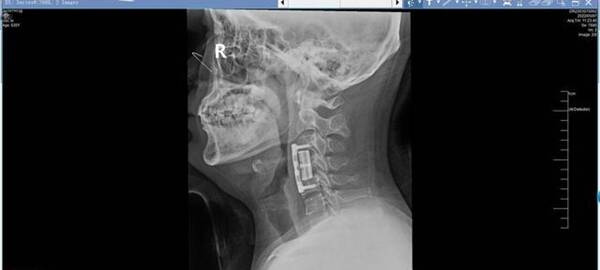 結(jié)合各項(xiàng)檢查結(jié)果,李濤院長為小陸量身制定手術(shù)方案,“頸前路椎體次全切除術(shù)+3D打印人工椎體植入鈦板重建術(shù)+椎間盤切除術(shù)”。僅用時(shí)1小時(shí),就將問題完全解決。術(shù)后當(dāng)天,小陸就覺得自己的疼痛徹底緩解了,感受到了這些天來前所未有的舒適。術(shù)后第二天,就可自行下地活動,復(fù)查X線提示為小陸定制的3D打印人工椎體與其完美適配。