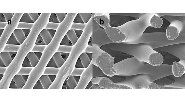 Osteopore植入物的蜂窩狀微觀結(jié)構(gòu),頂視圖(左)和側(cè)視圖(右)。圖片來自Osteopore
