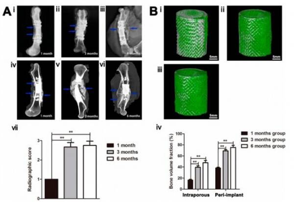 圖1.3D打印多孔Ti6A14V內(nèi)植物重建4 cm股骨缺損的放射學(xué)和生物力學(xué)分析。(A)植入后1個月、3個月和6個月的X線圖像(i-iii)植入后1、3和6個月的計算機斷層掃描圖像(iv-vi)。藍色箭頭表示缺損部位或植入物外表面新形成的骨。(vii)各組的放射學(xué)評分。(n=4)(B)處死后1、3和6個月組的microCT三維重建圖像(i-iii)(灰色表示鈦合金,綠色表示新生骨)。(ⅳ) 各組(n=4)內(nèi)植物周圍和孔內(nèi)區(qū)域骨體積分?jǐn)?shù)的定量結(jié)果。
