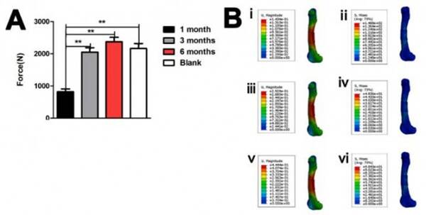 圖2. 3D打印多孔Ti6A14V內(nèi)植物重建股骨4cm缺損的生物力學(xué)分析。(A) 各組樣品的三點彎曲強度(n=4)(B)“內(nèi)植物-骨”復(fù)合體在(ii)1000 N、(iv)2000 N和(vi)3000 N下的應(yīng)力分布?!皟?nèi)植物-骨”復(fù)合體在(i)1000N,(iii)2000N和(v)3000N下的位移分布.(**p<0.01,*p<0.05)。