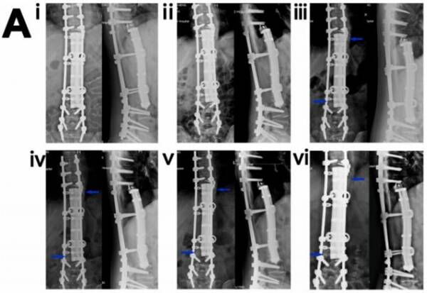 圖4.3D打印多孔Ti6Al4V內(nèi)植物重建脊柱骨缺損(病例1)。(A) (i-vi)術(shù)后1個月(i)、3個月(ii)、7(個月iii)、12個月(iv)、24個月(v)和32(vi)個月的“內(nèi)植物-骨”X線圖像。藍色箭頭表示內(nèi)植物與骨界面或內(nèi)植物外表面新生骨。(B)術(shù)后3個月(i)、7個月(ii)、12個月(iii)、28個月(ⅳ)、32個月(v)和36個月(vi)的CT圖像。藍色箭頭表示種植體-骨界面或種植體外表面新形成的骨。
