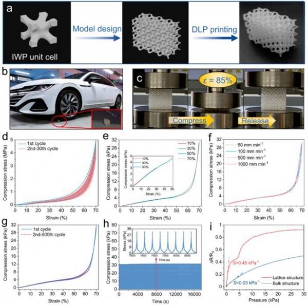 如圖2所示,為了提高傳感器的壓縮應變能力,PIFS在設計上采用了以彎曲為主的晶格結(jié)構(gòu)。在相同的表觀體積下,具有晶格結(jié)構(gòu)的柔性傳感器重量約為實體結(jié)構(gòu)的三分之一。具有晶格結(jié)構(gòu)的PIFS表現(xiàn)出很好的彈性,更好的能量吸收能力,即使在被汽車碾壓后也能迅速恢復,并且沒有ILs從聚合物基體中泄漏。