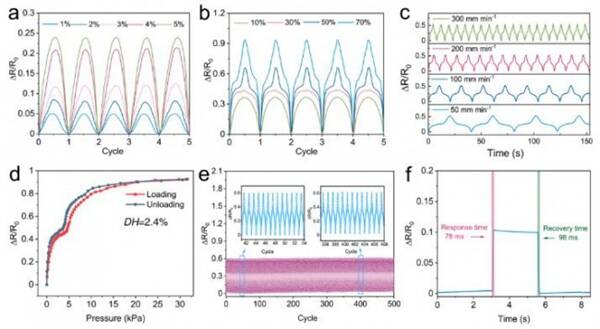 如圖3所示,研究人員通過動態(tài)循環(huán)加載實驗,觀察電阻信號變化,進一步研究了PIFS的傳感性能。PIFS能夠檢測微小形變。得益于多孔晶格結(jié)構(gòu)的設計,在壓縮過程中,PIFS多孔結(jié)構(gòu)的變形降低了彈性體基體粘彈性的影響,具有低滯后性。此外,在高速和長期循環(huán)加載期間,PIFS具有高彈性,可以快速恢復其原始形狀,輸出穩(wěn)定信號來滿足需求。