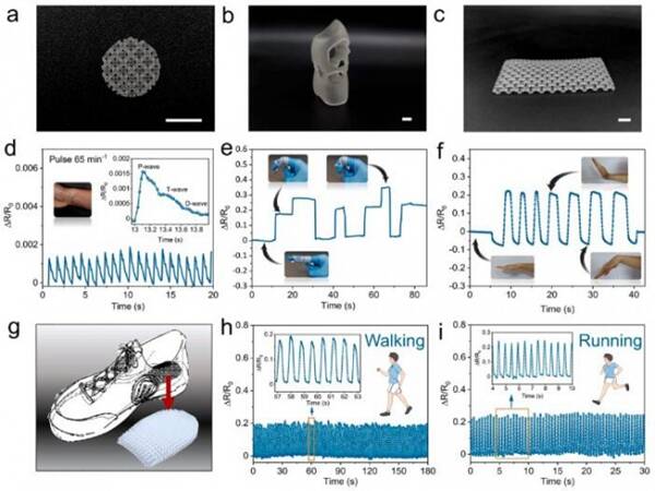 晶格結(jié)構(gòu)的PIFS具有更好的壓力靈敏度,它可用于檢測極小的壓力變化。如圖4所示,研究人員設計了一系列結(jié)構(gòu)定制的PIFS作為可穿戴傳感器來監(jiān)測人體運動。將具有多孔結(jié)構(gòu)的柔性膜連接到腕部皮膚,以評估腕部的彎曲程度。傳感器可以清楚地區(qū)分手腕的向前和向后彎曲姿勢。將具有多孔網(wǎng)格結(jié)構(gòu)的鞋墊放置在鞋子中,以記錄人類的行走和跑步姿態(tài)。晶格結(jié)構(gòu)的引入,使傳感器足夠輕巧,并改善了佩戴體驗。