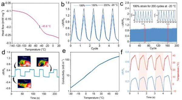 如圖5所示,研究人員通過差示掃描量熱法(DSC)測定了PIFS的玻璃化轉(zhuǎn)變溫度(Tg)。相對較低的Tg表明PIFS在低溫環(huán)境中仍然可用。研究人員將手指套PIFS冷凍了一天,手指套PIFS依然能提供穩(wěn)定且可逆的信號。PIFS在低溫下具有更高的溫度靈敏度,能檢測到很小的溫度變化,可用作溫度傳感器,實時監(jiān)測溫度。