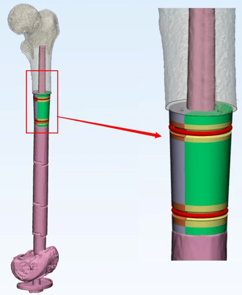 3D打印“瓦片”假體套件可以加長(zhǎng)原初次手術(shù)組配假體與股骨殘端的接觸長(zhǎng)度,假體套件表面針孔樣磨砂面可以增大與周圍軟組織接觸面積,假體套件表面預(yù)制凹槽可以用鈦纜加固行力學(xué)固定;最后假體套件及股骨殘端組織界面固定人工骨可以促進(jìn)愈合,進(jìn)一步加強(qiáng)生物學(xué)固定。