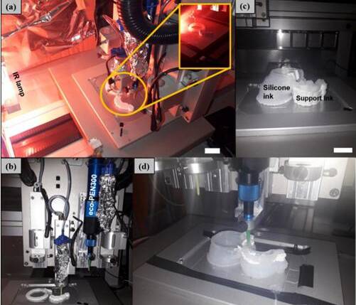 硅膠墨水由Dragon Skin 30、SLO-JO緩凝劑和親水性氣相法二氧化硅混制而成,犧牲墨水選用Nivea Cream?;陔p噴頭3D打印機(jī),使用硅膠墨水打印模型結(jié)構(gòu)部分、犧牲墨水打印支撐結(jié)構(gòu)部分。每打印兩層,使用紅外燈進(jìn)行60秒的光固化。打印完成后,用純水清洗去除支撐結(jié)構(gòu)。