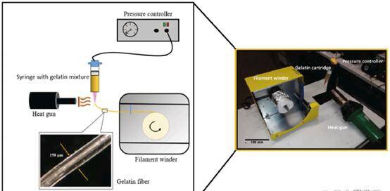 研究者使用下圖3中自制的明膠纖維收集裝置。將制備的明膠纖維按照一致的取向手動分配在硅膠模型外側(cè),并進(jìn)一步將復(fù)合模型浸入硅膠墨水中,用硅膠墨水覆蓋上述明膠纖維。綜上,研究者采用3D打印硅膠模型、纏繞定向明膠纖維、浸涂硅膠外層的方法,制備“三明治”夾層結(jié)構(gòu)、明膠纖維增強(qiáng)的主動脈復(fù)合模型。