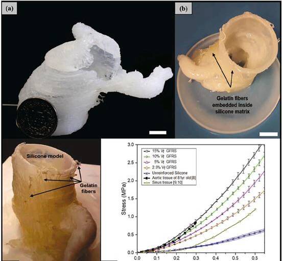 在本研究中,Paolo Ermanni團(tuán)隊構(gòu)建了一種明膠纖維增強(qiáng)的新型硅基復(fù)合材料,開發(fā)了單向明膠纖維的制備技術(shù),利用3D打印技術(shù)制備了兼具患者特定幾何形狀且主動脈組織真實材料特性的手術(shù)規(guī)劃模型。