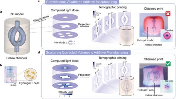 △散射校正層析體積增材制造(VAM),允許在散射材料中打印具有中空通道的復(fù)雜幾何形狀,如負(fù)載細(xì)胞的水凝膠等。圖片來(lái)自onlinelibrary