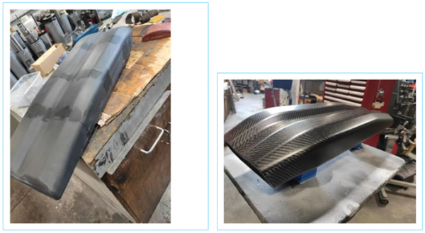 3D打印也被用于制作渦輪增壓發(fā)動機(jī)的排氣管,下左圖是打印樣件。首先會用FUNMAT HT將樣件分塊打印,然后把幾塊樣件的表面仔細(xì)打磨后拼接在一起。下右圖是復(fù)合材料模具經(jīng)過整個碳纖維鋪設(shè)和固化過程后制成的最終高性能產(chǎn)品。