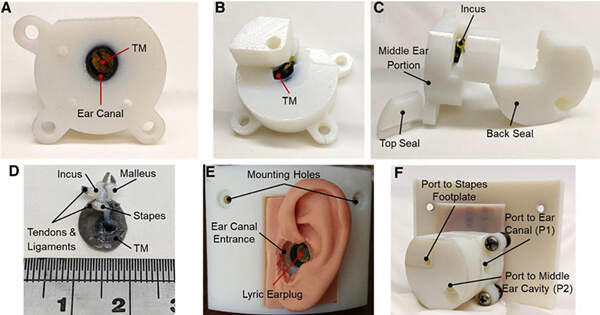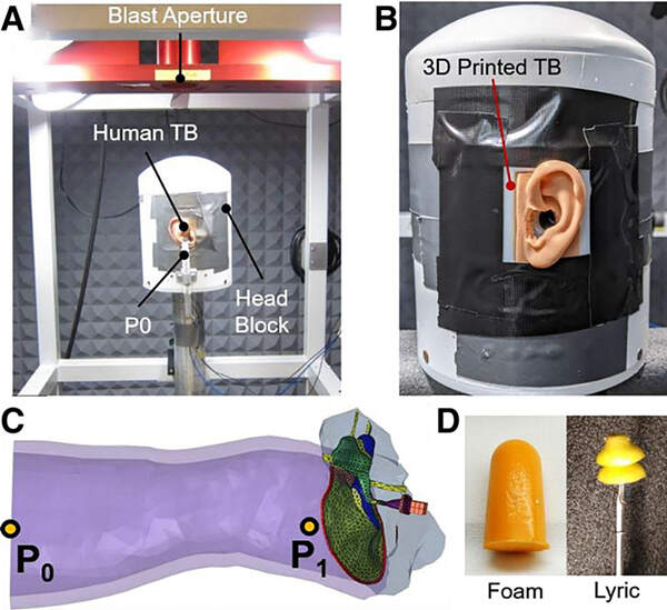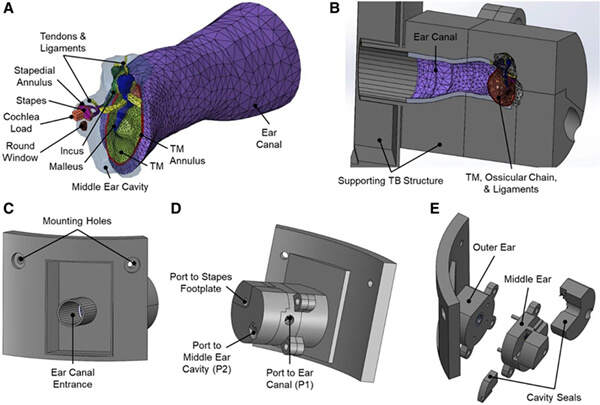 已經(jīng)使用人類尸體顳骨 (TB) 和各種計算和實驗方法研究了各種 HPD 耳塞在受到噪聲脈沖或爆炸時的保護能力。在他們的研究中,俄克拉荷馬州的團隊開發(fā)了一個 3D 打印的 TB 模型,該模型由柔性和硬質(zhì)聚合物制成,包含 TM、耳道、中耳懸韌帶和肌腱、聽骨鏈和中耳腔。