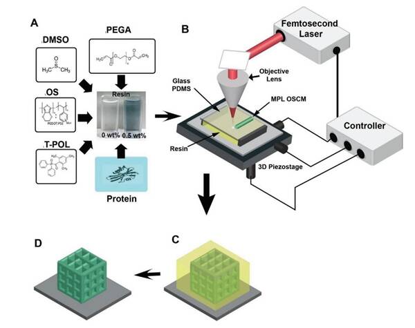 在他們的論文中,研究人員將MPL確定為"最先進"的直接激光寫入(DLW3D打印技術,因為它的材料多樣性和它能夠實現(xiàn)的高水平的精度(低至15納米的分辨率)。因此,休斯頓團隊認為該技術是生產納米電子器件類型的理想選擇,這些器件在過去幾年中已成為重點研究的對象。然而,3D打印這種生物植入物的可行性仍然受到原材料低導電性的限制。據(jù)科學家們說,這是由于生物電子原型通常是由碳納米管或石墨烯制成的,因此它們具有無機特性——"很難在樹脂中均勻地分散""沒有明顯的相分離"。為了繞過這些缺點,休斯頓的研究人員開發(fā)了一種獨有的MPL樹脂,由加載了DMSOPEGA聚合物、PEDOT:PSS有機半導體、層粘連蛋白和葡萄糖氧化酶組成,可以精確地3D打印成具有同質性的迷你生物電路板。