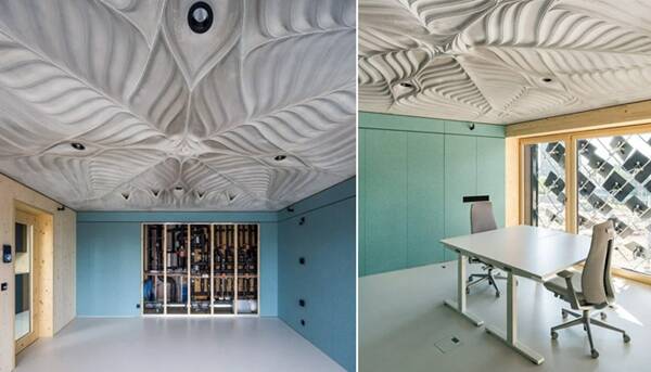 這件藝術品在去年秋天被安裝到瑞士 ETH NEST 研究大樓中,它是由 3D 打印模具制成,與傳統(tǒng)方法相比,使用的材料減少了 70%。天花板結構具有彎曲的形狀,很容易讓人聯(lián)想到樹葉的結構。這件由3D 打印制作完成的復雜建筑結構,如果采用任何的制作方式恐怕很難完成。