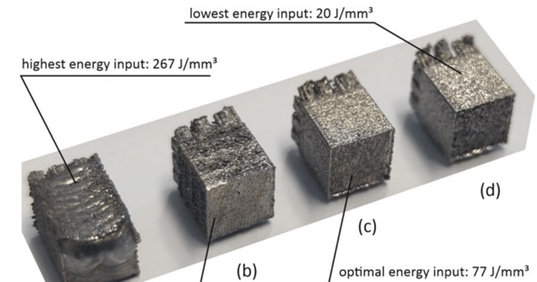 △一組印刷的樣品立方體,展示了激光功率和印刷速度對磁芯結(jié)構(gòu)的影響。圖片來源:塔林理工大學(xué)